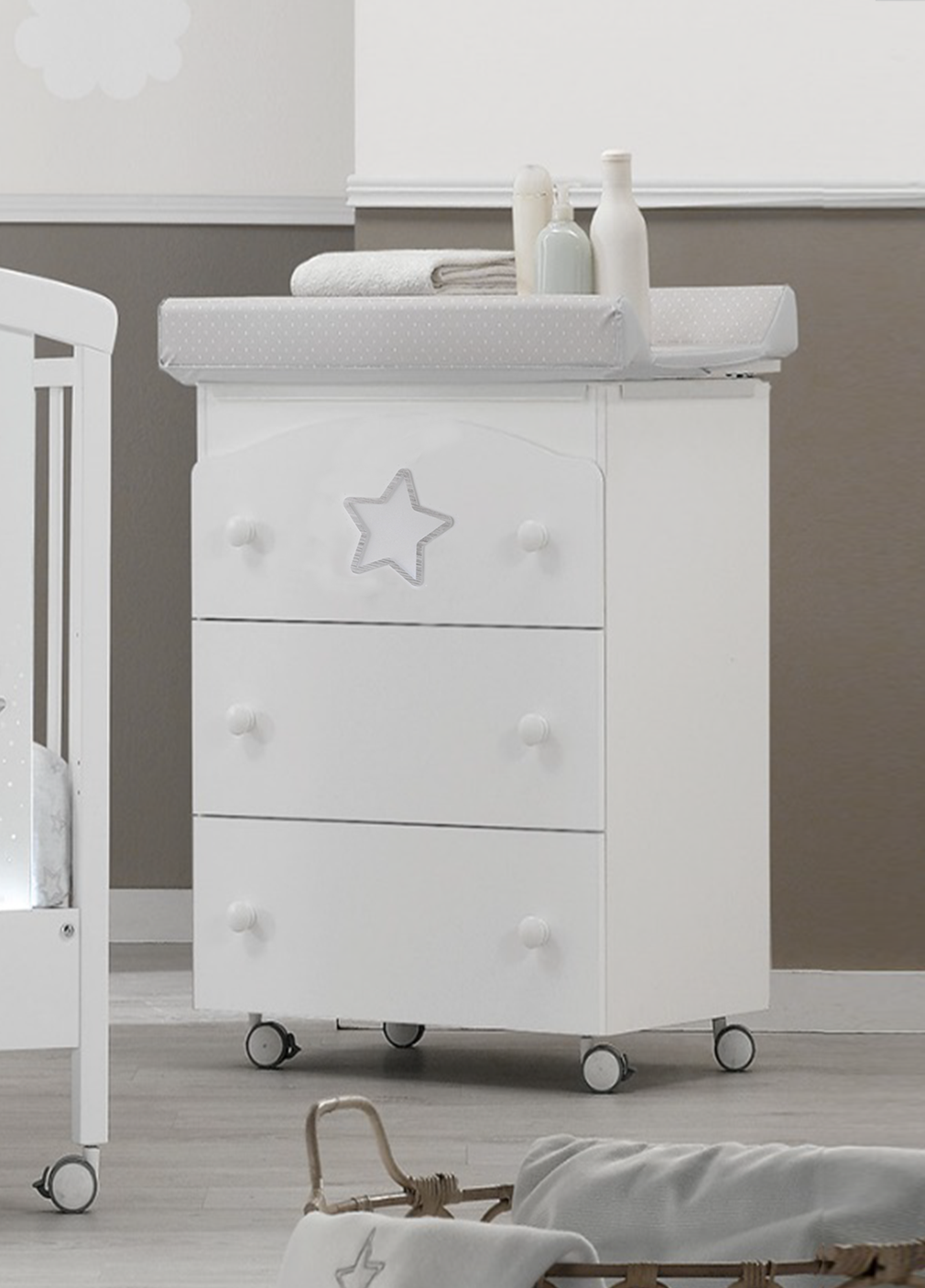 Пеленальный комод ERBESI Star с ванночкой (Эрбеси Стар) - станет прекрасным дополнением к кроватке ERBESI Star . Функциональный комод с вместительными ящиками для детских вещей, пеленальным столиком с удобными бортиками безопасности и местом для хранения ванночки, которая так же входит в комплектацию комода. Теперь переодевать, купать ребенка станет гораздо удобнее.