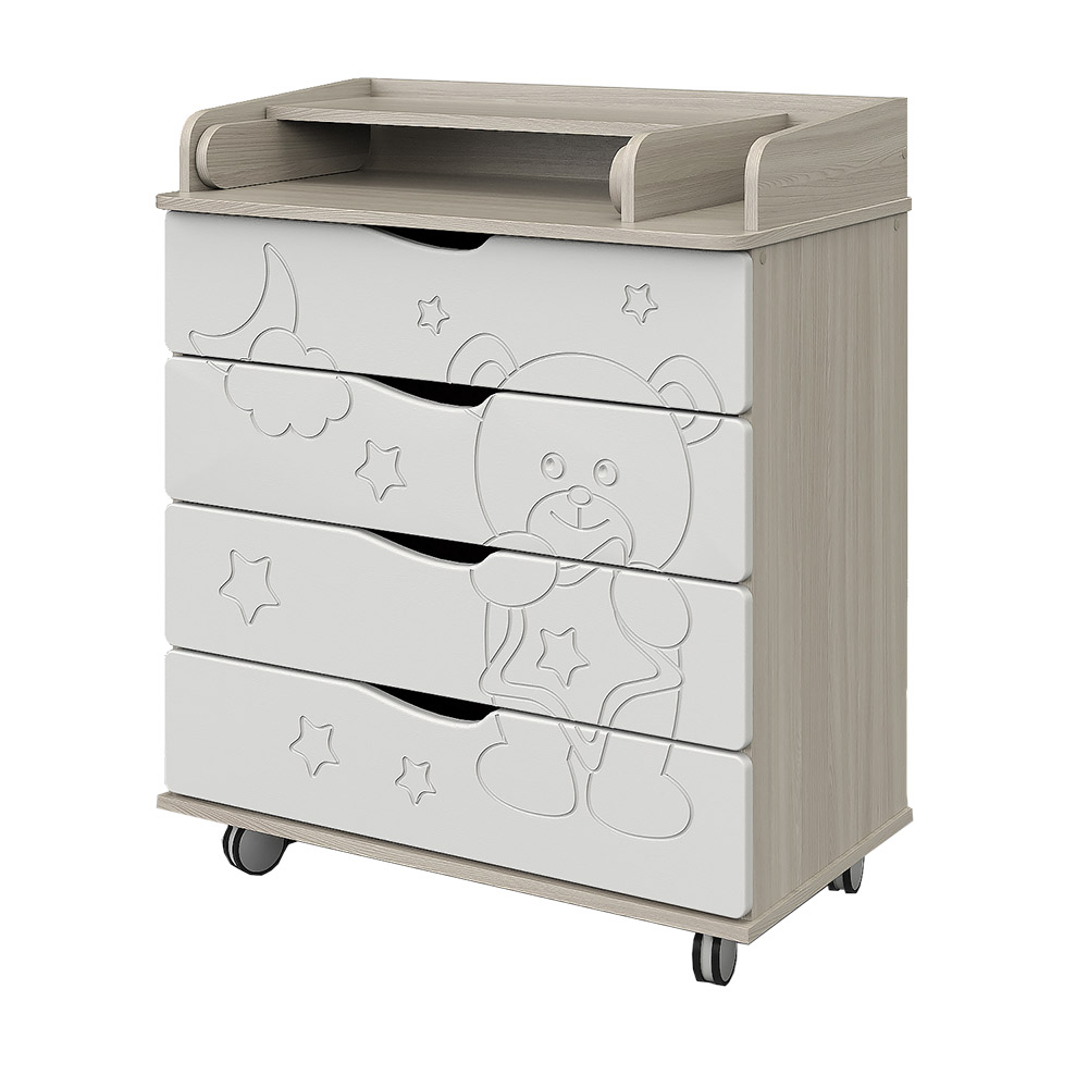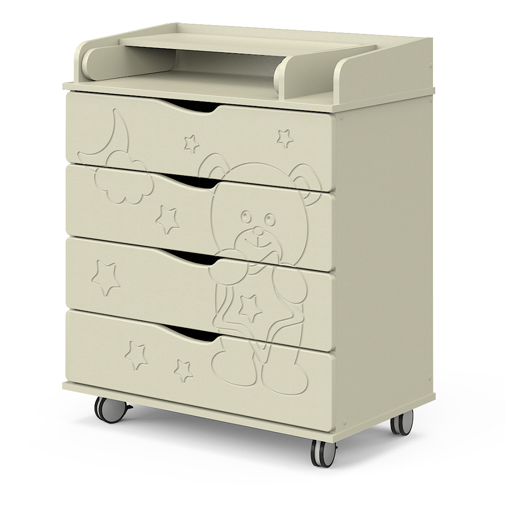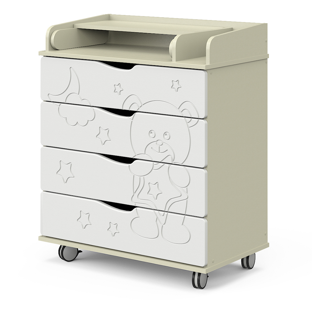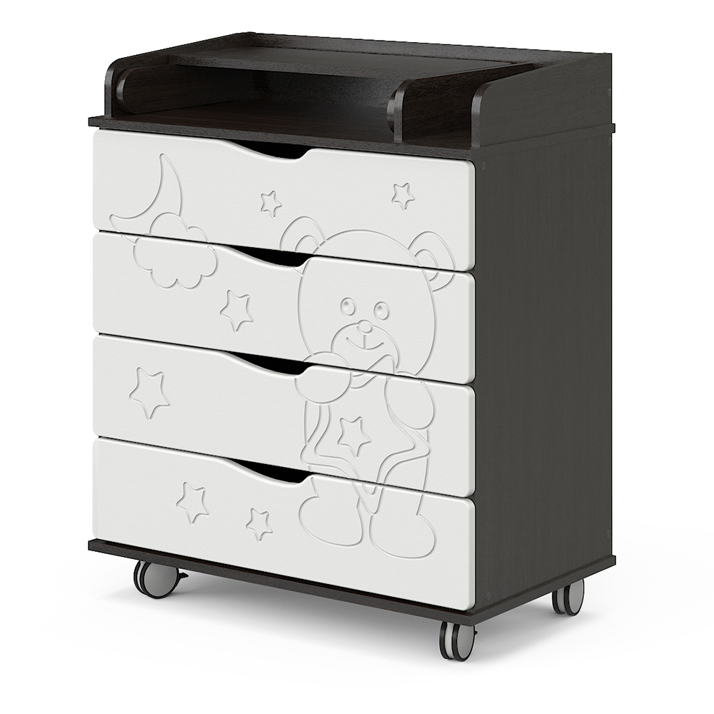 Пеленальный комод PITUSO Мишутка - удобный и практичный комод на колесиках со складным пеленальным столиком. Фасад комода украшен медвежонком, что, несомненно, украсит детскую комнату и создаст волшебную атмосферу. 4 вместительных ящика оснащены шариковыми направляющими.