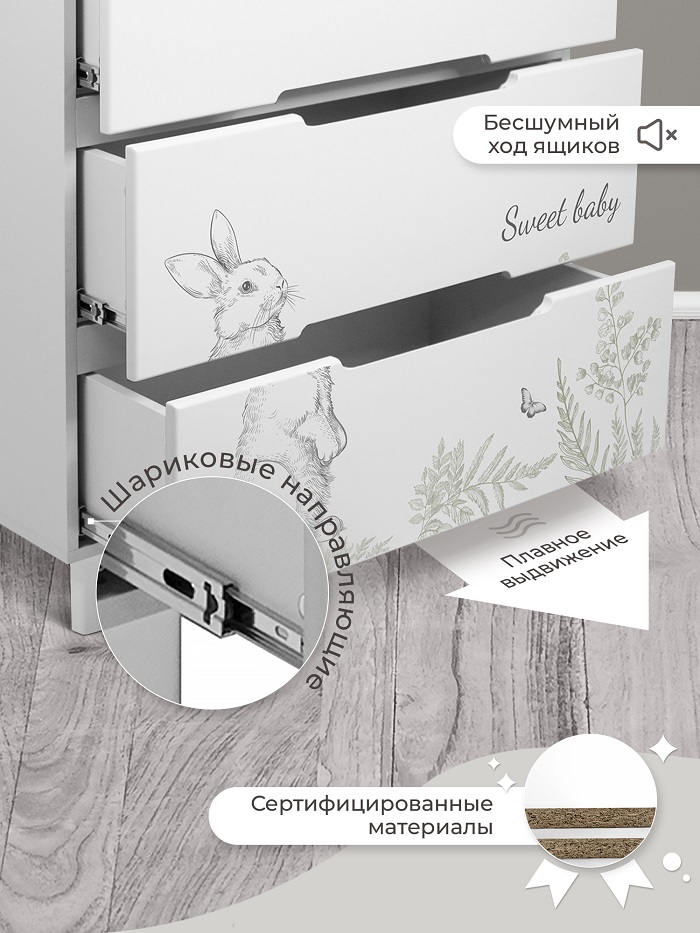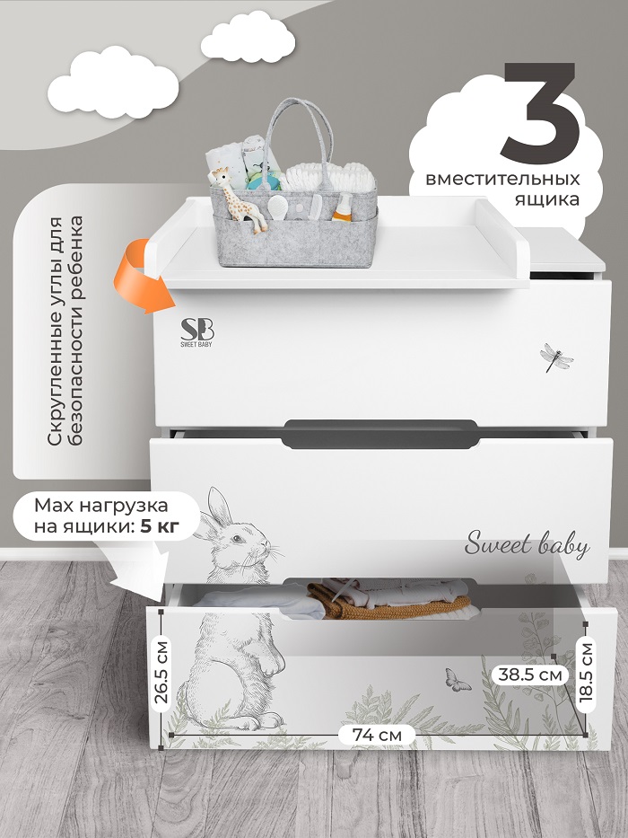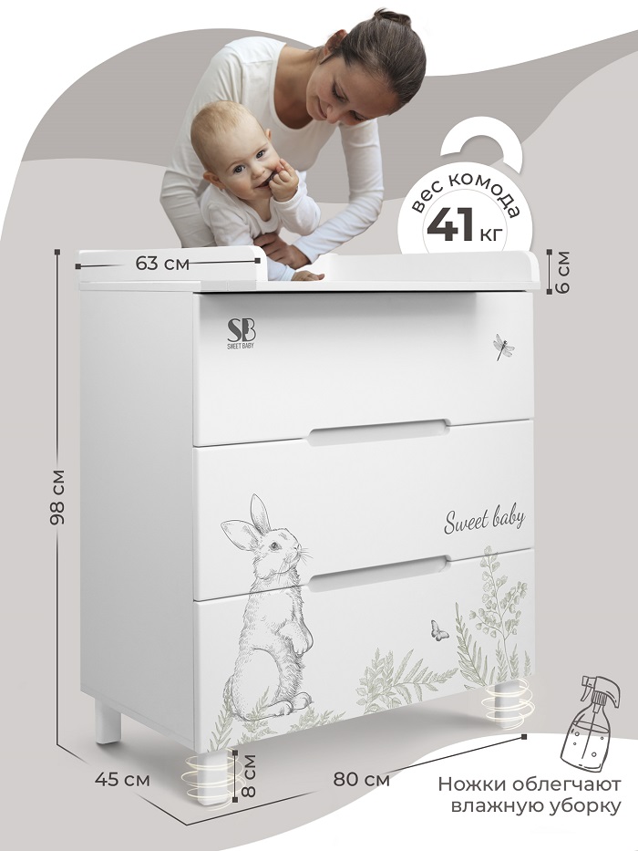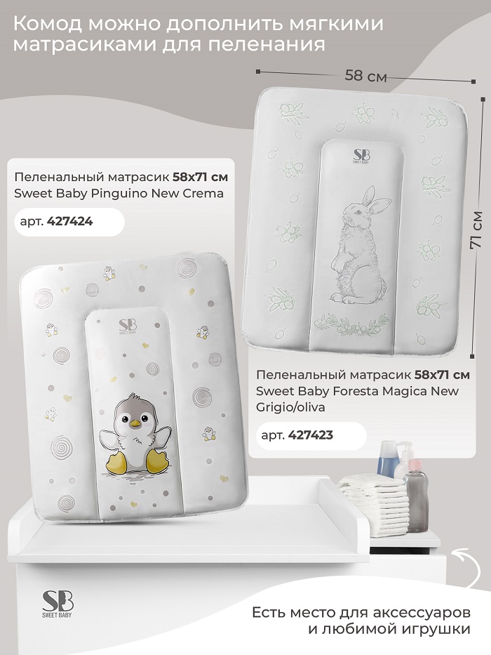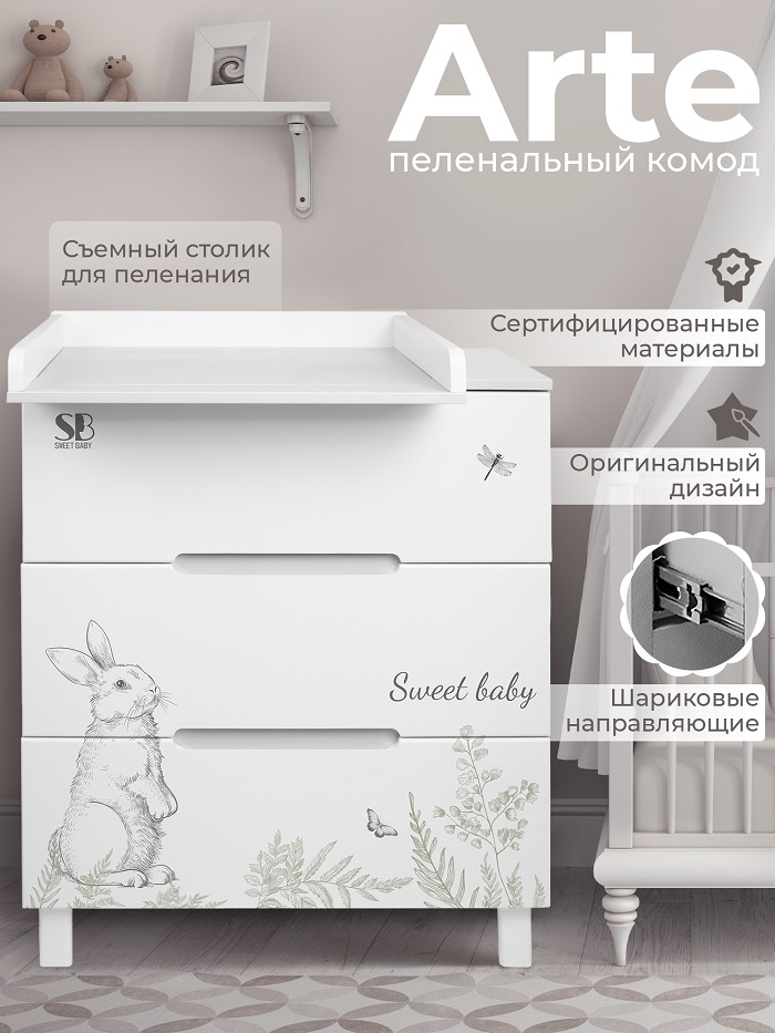 Пеленальный комод Sweet Baby Arte (Свит беби арте) - стильный комод в скандинавском стиле с легкосъемным пеленальным столиком. Комод выполнен в трендовых расцветках этого сезона и украшен милыми детскими рисунками. Все уголки комода закруглены, что обеспечивает безопасность ребенку. Современные интегрированные ручки удобны в использовании.