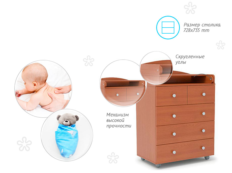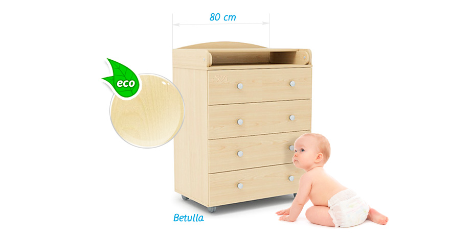 Корпус и фасады ящиков выполнены из ламинированной древесно стружечной плиты, соответствующей стандартам безопасности. Кромка изделия создана из влагостойкого АБС пластика, который, не смотря на свою эластичность, имеет повышенную ударопрочность. Благодаря этому, мебель надолго сохранит свой внешний вид и идеальные углы. Мягкость материала снижает вероятность травмирования малыша.