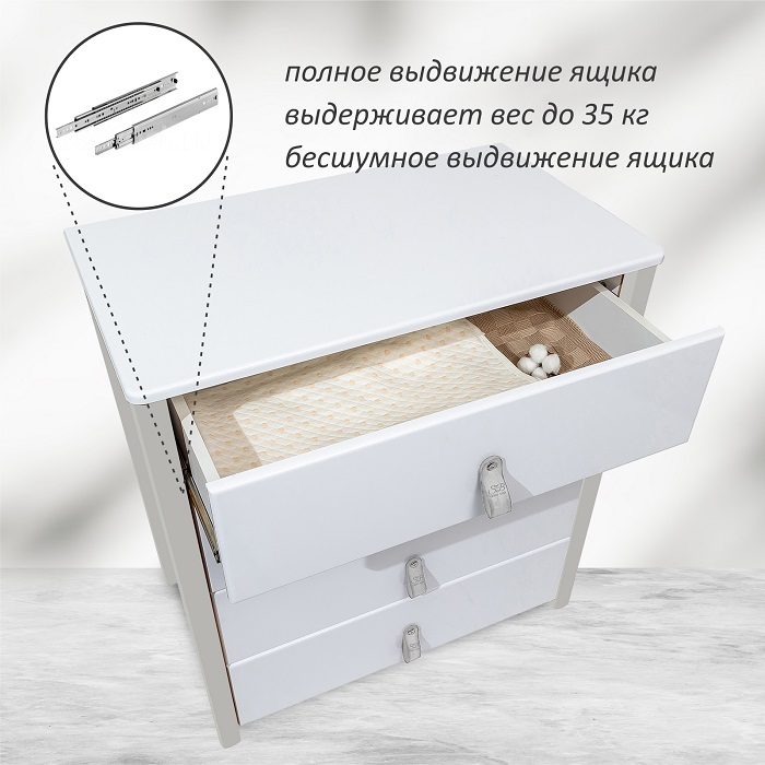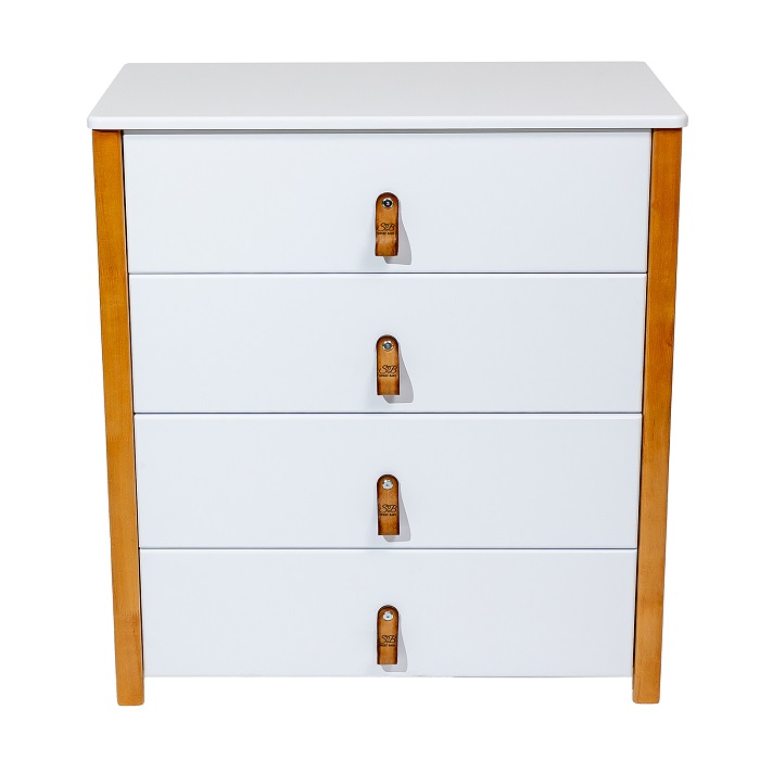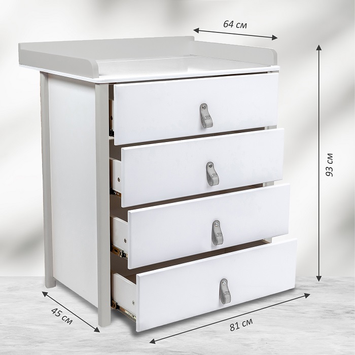 Комод большой , с 4 вместительными ящиками. Очень удобная система с мягким выдвижением, использованная в этом комоде, обеспечит плавное и бесшумное закрытие ящиков, что делает его идеальным для использования в спальне маленьких детей.