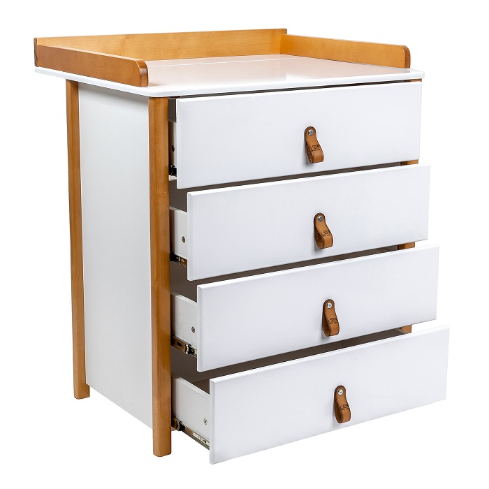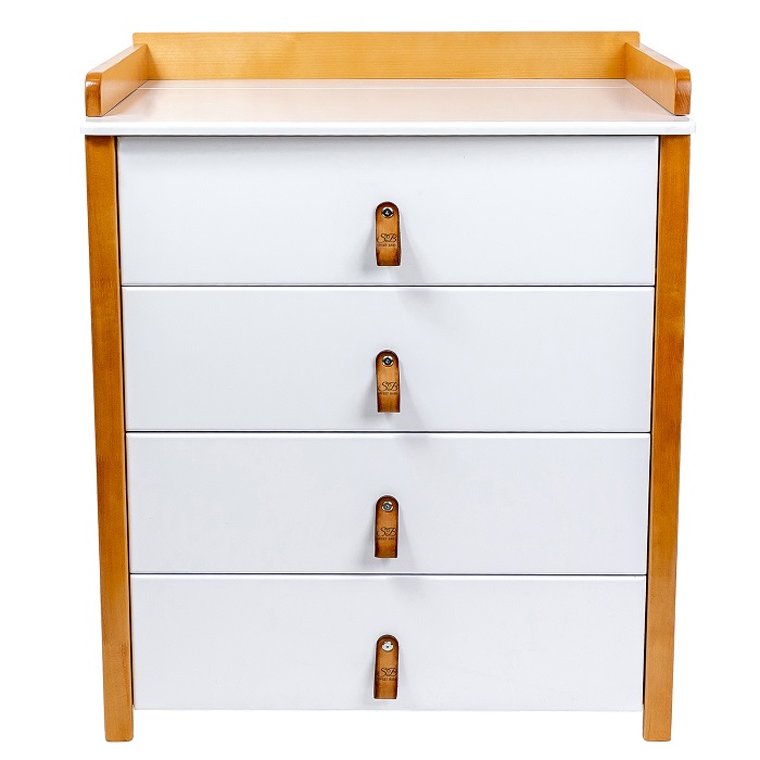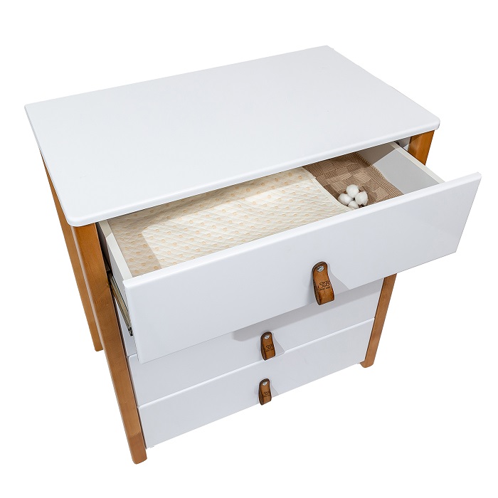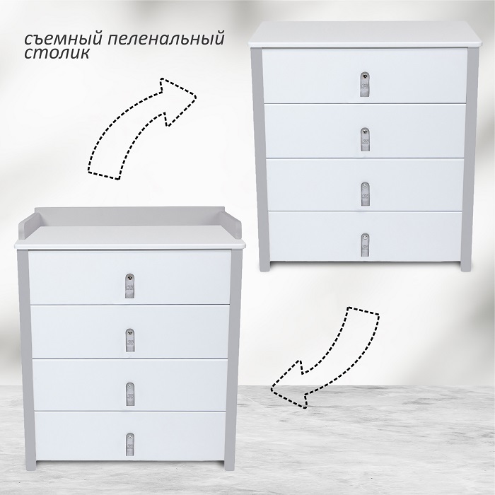 Комод оснащен съемным пеленальным столиком, что позволит на первые месяцы после рождения ребенка превратить комод в пеленальный, а затем в бельевой.
