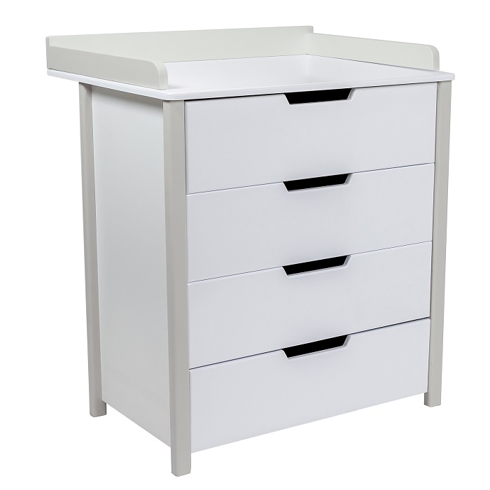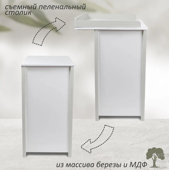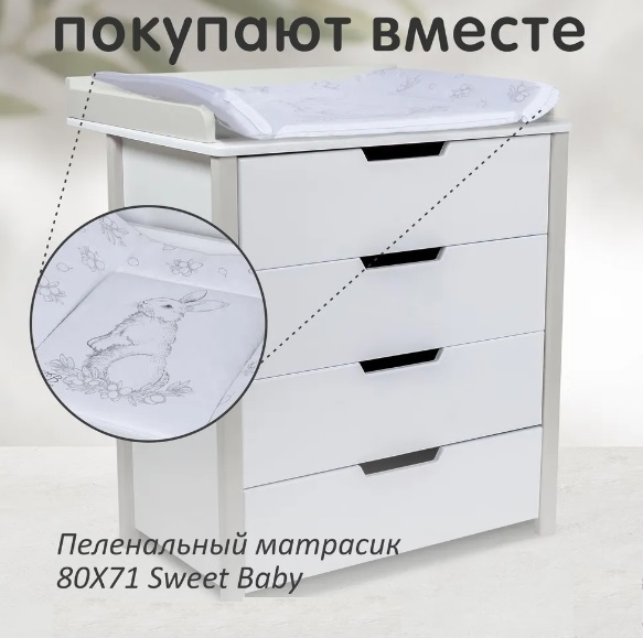 Комод выполнен в самых востребованных на данный момент расцветках: белый/белый, белый/кашемир, белый/натуральный и белый/серый, что позволяет идеально подобрать комод к детской кроватке.