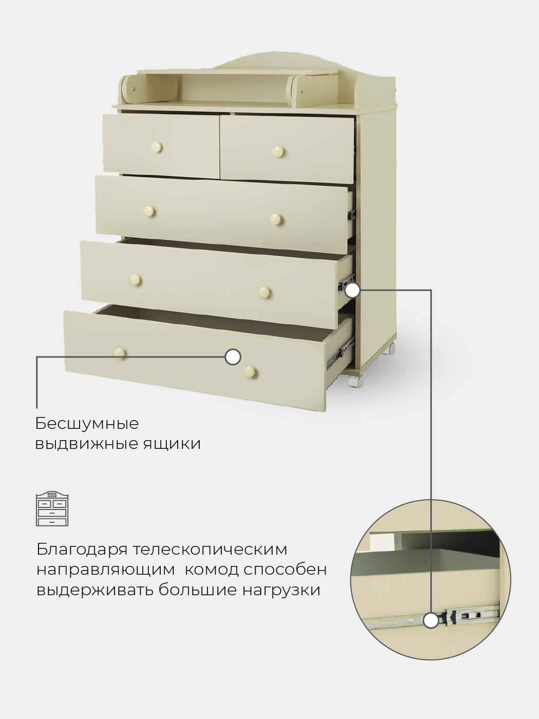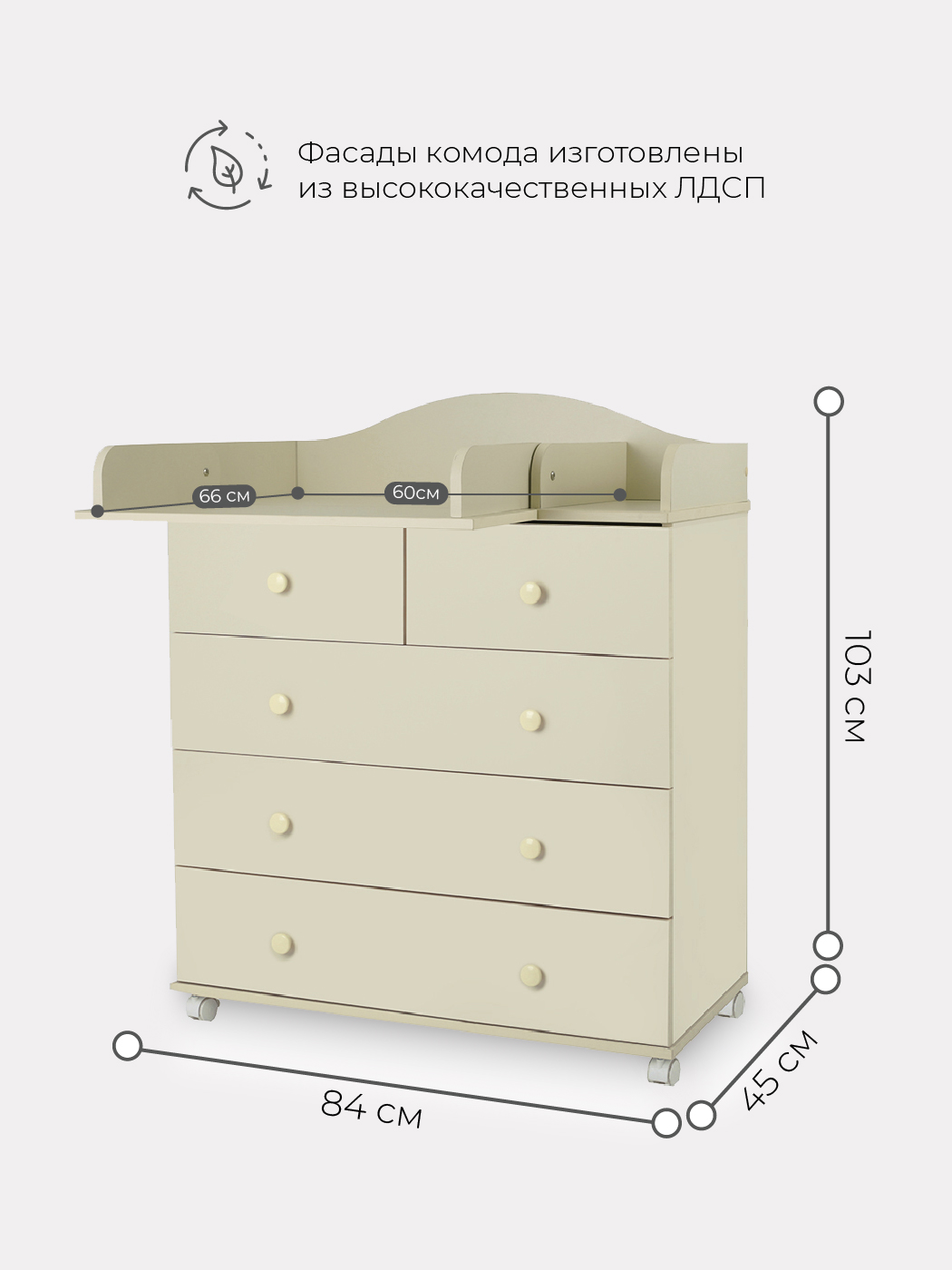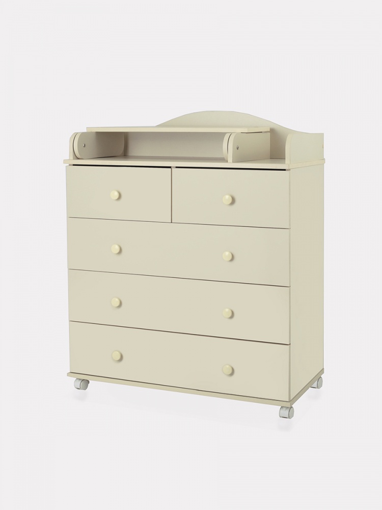 Комод Топотушки Фортуна Плюс 800/5 (арт. 84) - безопасный и качественный комод с пеленальной поверхностью. Комод имеет специальную стропу для жесткого крепления к стене, но при необходимости его легко передвинуть с помощью 4 колес. Комод оснащен 5 вместительными ящиками и удобными ручками. Все ящики бесшумно открываются и закрываются, чтобы не потревожить сон ребенка. Удобный пеленальный столик легко раскладывается для удобства переодевания ребенка.