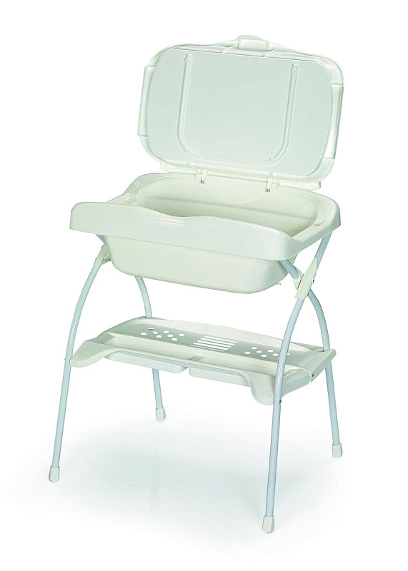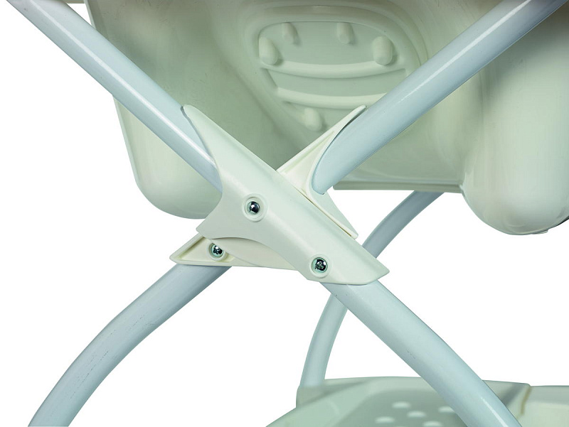 - надежную, металлическую базу с закругленными уголками и противоскользящими ножками. Компактно и удобно складывается. Так же на базу устанавливается удобная полочка для вещей, игрушек, гигиенических средств ребенка.