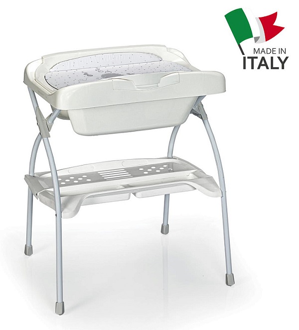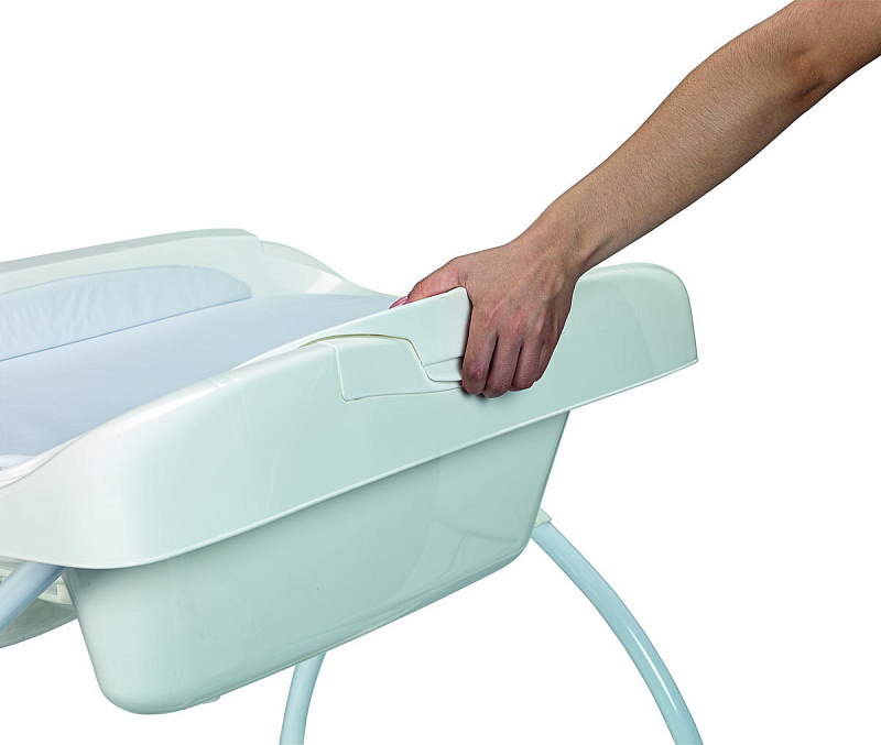 - пеленальный столик со стеганным водонепроницаемым матрасиком из ПВХ. Он легко откидывается, когда малыш купается в ванночке и удобно устанавливается, когда необходимо вытирать и переодевать ребенка. Бортики по краям делают нахождение ребенка на столике более безопасным, но напомним, что нельзя оставлять ребенка на пеленальном столике без присмотра!