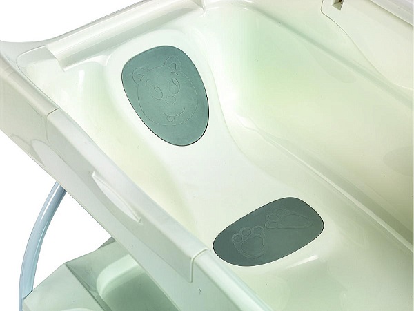 - удобную ванночку анатомической формы с противоскользящими накладками. Сидение имеет два варианта использования: для новорожденного малыша и уже для самостоятельно сидячего ребенка. Такая ванночка пригодится до 1 годика, и выдерживает нагрузку до 11 кг. Для удобства использования предусмотрено специальное отверстие для подвода воды через трубку, облегчающее наполнение или слив ванночки.