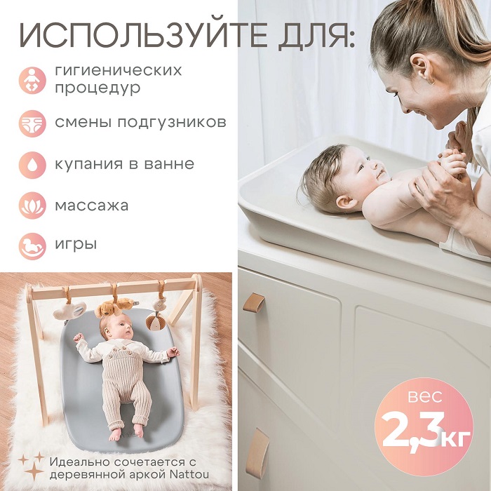 Пеленальный матрасик-подложка Nattou (натту) - уникальная новинка! Инновационный матрасик для пеленания, гигиенических процедур, массажа, пальчиковых игр или смены подгузника. Выполнен из практичного пенополиуретана, который создает ощущение «теплой кожи», гарантируя малышу мягкость и комфорт. Благодаря своей структуре легко подстраивается под форму тела ребенка.