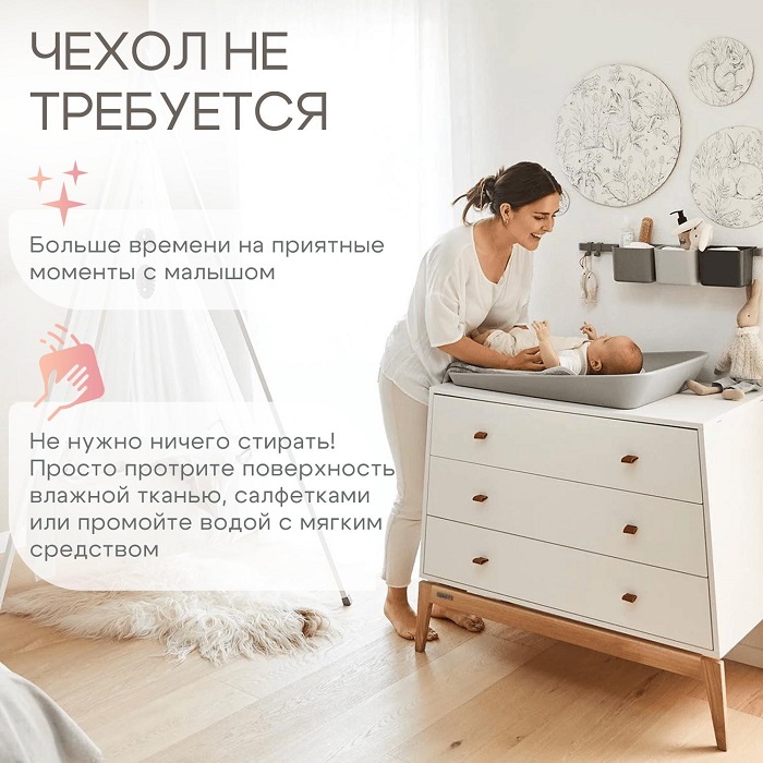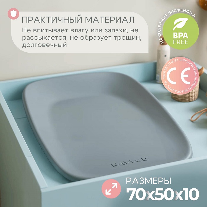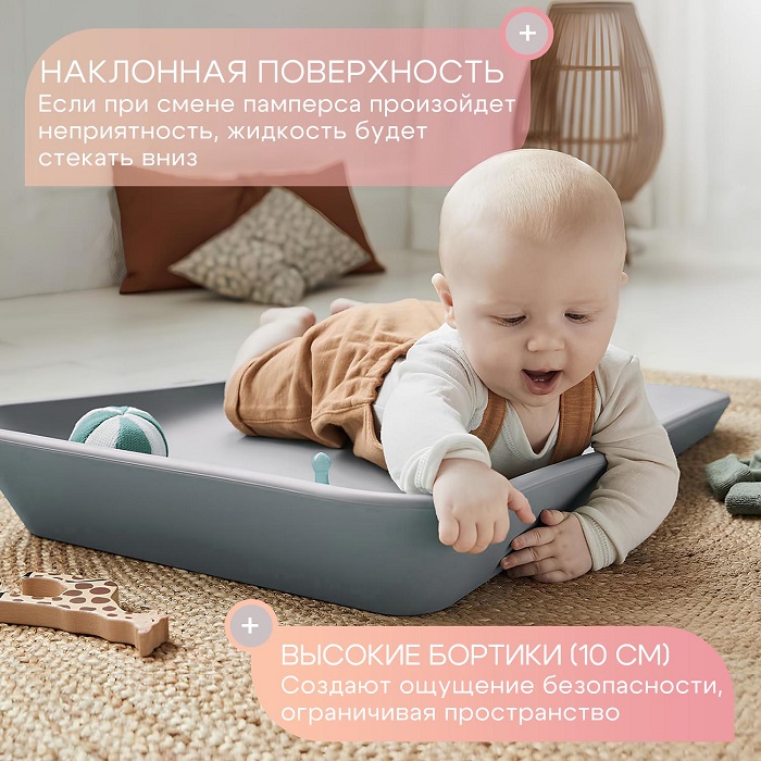 Нескользящая поверхность и высокие бортики создадут безопасное пространство. Подходит для пеленальных столиков стандартного размера 50x70 см. так же может использоваться на любой другой поверхности.