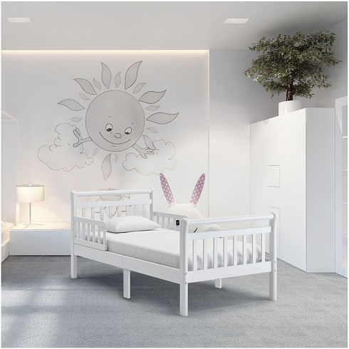 Ножки являются расширенными внизу, что не допускает опрокидывания кровати. Реечная конструкция спинки имеет поперечную перекладину, которая, помимо создания общего образа минимализма, имеет и функциональное предназначение и может служить для навешивания игрушек или вещей первой необходимости. Просторное ложе 160*80 см подарит детям наслаждение от комфорта и уюта. Сон ребёнка в такой кровати станет спокойным и безмятежным.