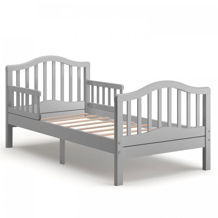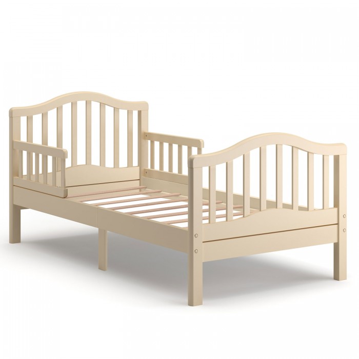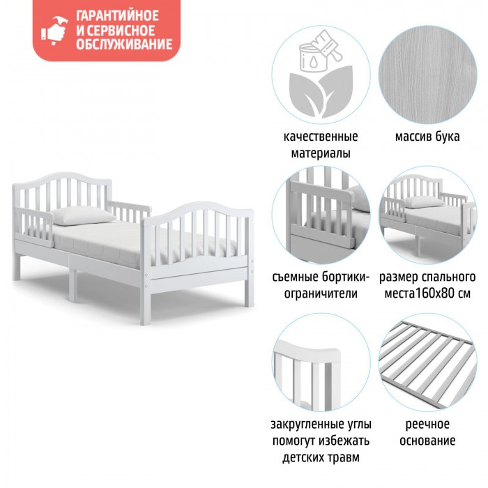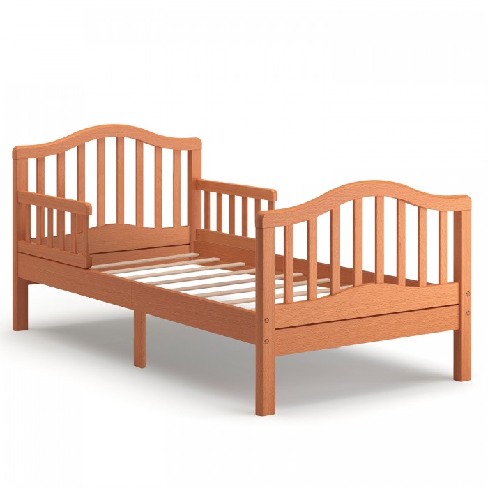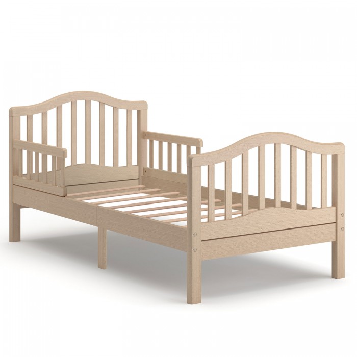 Ножки кровати идеально прямые, что не допускает опрокидывания или расшатывания даже при повышенной активности ребёнка. Волнообразная верхняя линия спинки, продублированная таким же изгибом у основания, является отличным дизайнерским решением. Ложе у кроватки стандартное: 160*80 см, подобный размер подойдёт каждому среднестатистическому подростку.
