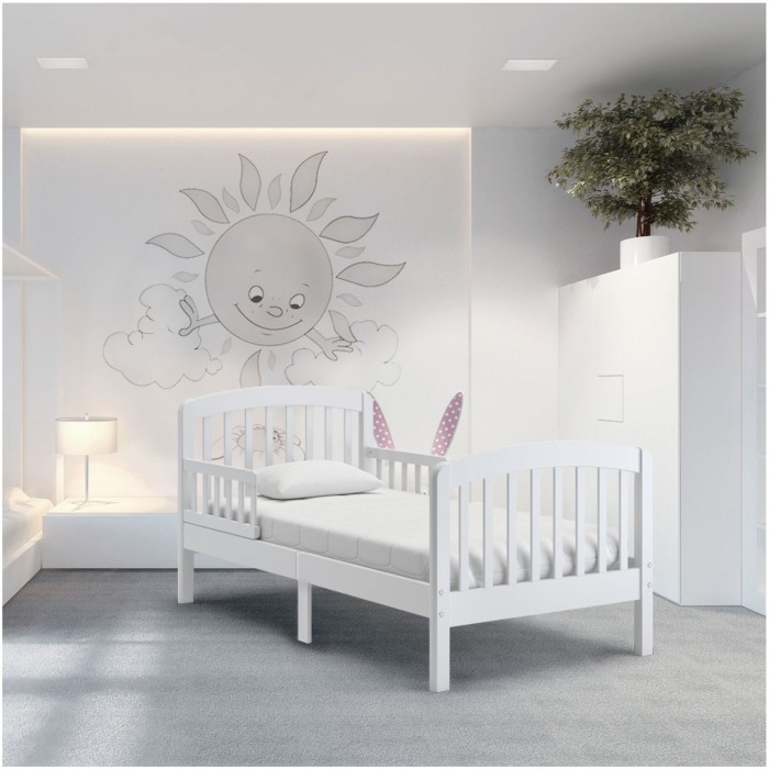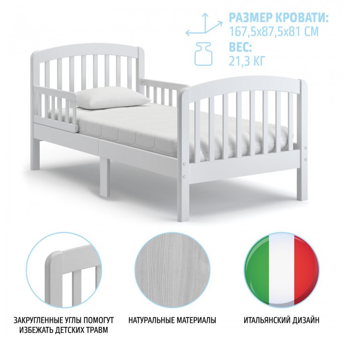 Кровать Nuovita Incanto подойдёт как для маленьких деток, начиная с трёхлетнего возраста, так и для детей-подростков. Создателями заботливо предусмотрены съёмные бортики-ограничители, установленные в головной части кровати. Тем самым предотвращается возможность падения спящего ребёнка.