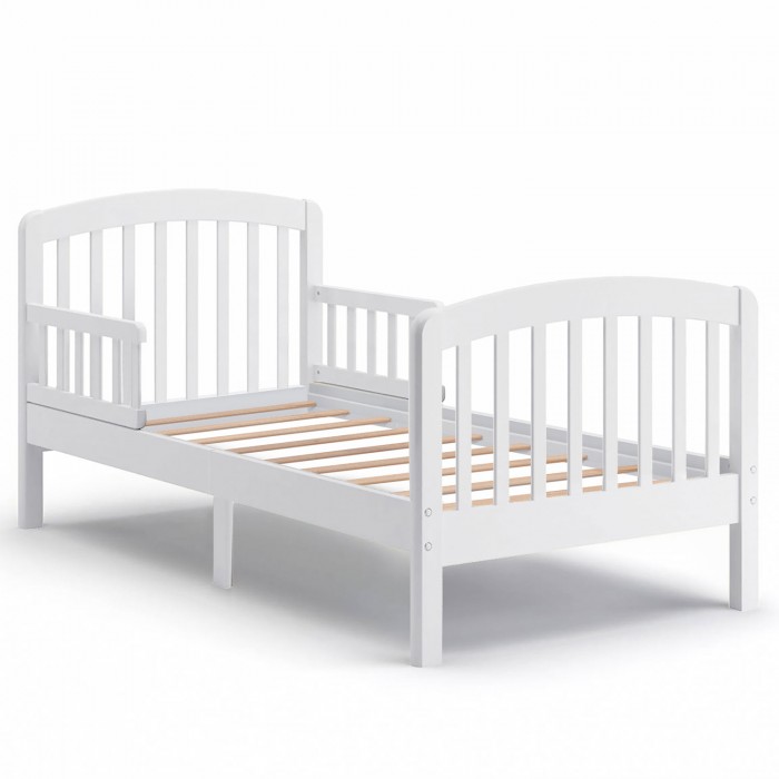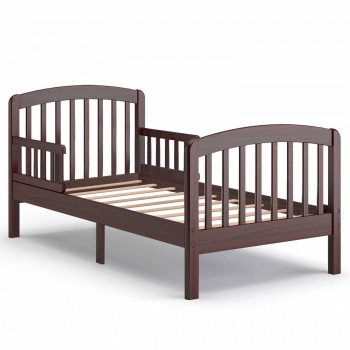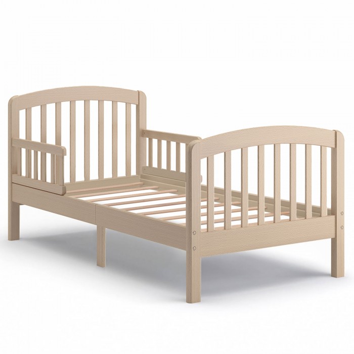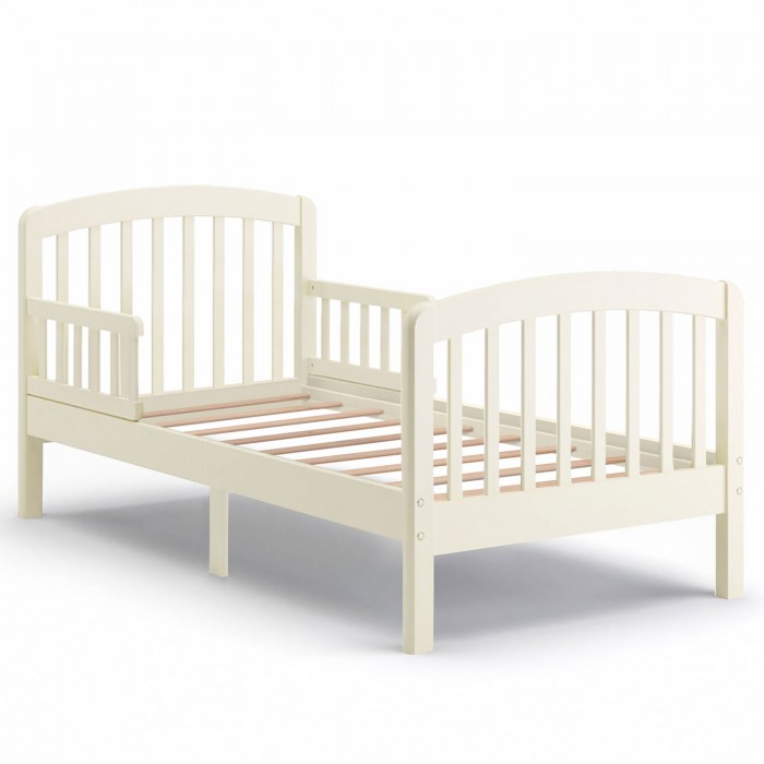 Изящное реечное изголовье кровати имеет и функциональное предназначение, благодаря ему родителям даже на расстоянии хорошо виден спящий ребёнок. Мягкий изгиб спинки является дизайнерским решением, относящимся к классическому варианту минимализма и выполненным в традициях итальянских краснодеревщиков.