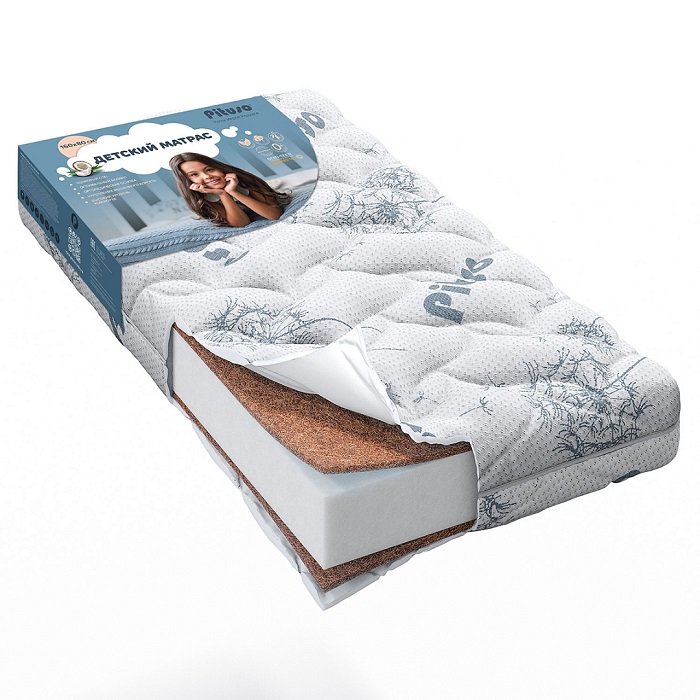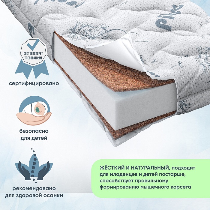 С обеих сторон матраса расположены слои из кокосовой койры, которые обеспечивают ортопедическую жесткость. Кокос относится к оптимально-жестким наполнителям и рекомендован новорожденным малышам для правильного формирования мышечного корсета.