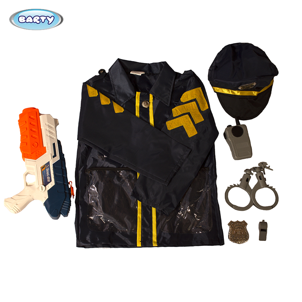 - набор полицейского: фуражка и куртка полицейского с жетоном, рация, водяной пистолет, наручники, свисток.