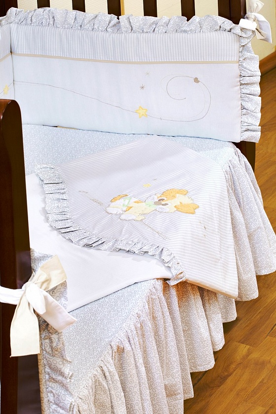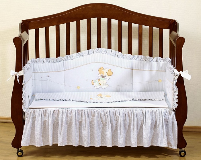 Постельный комплект в кроватку Giovanni Puppy (Джиованни Паппи) - Стильный дизайн, натуральные и безопасные материалы, сочетание спокойных и мягких пастельных тонов, декорирован вышивкой и тканевыми аппликациями. Бампер длиной 240см можно установить как в изголовье кроватки в варианте для новорожденного, так и в варианте диванчика для подросшего малыша. Простыня на резинке не позволит складкам воздействовать на кожу ребенка, а юбка придаст изысканный внешний вид детской кроватке.