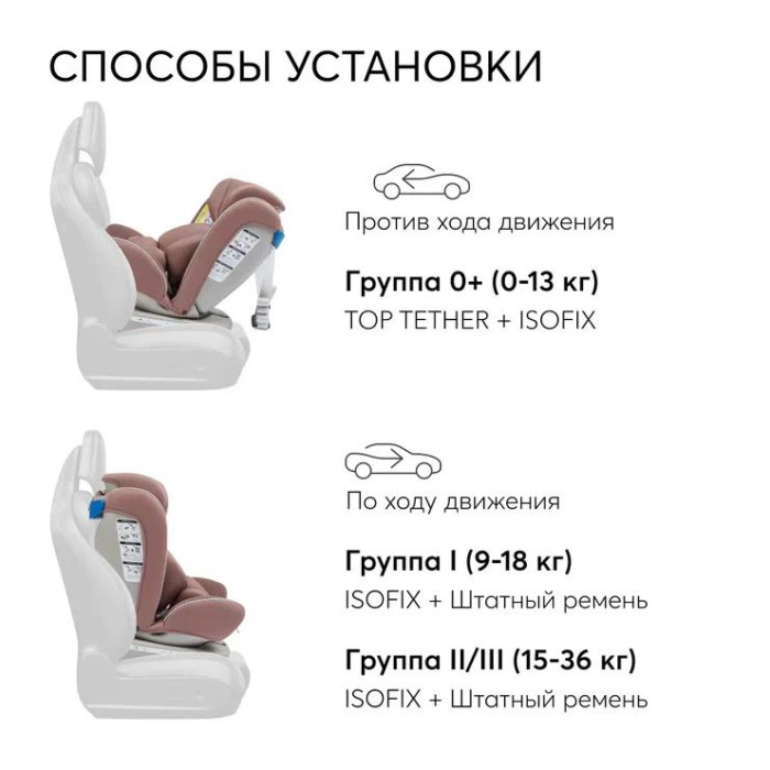 Для группы I (9-18 кг) допускается два варианта установки: - трехточечные автомобильные ремни; - трехточечные автомобильные ремни в сочетании с системой ISOFIX. Разрешено использовать только в положении наклона 1,2 или 3.