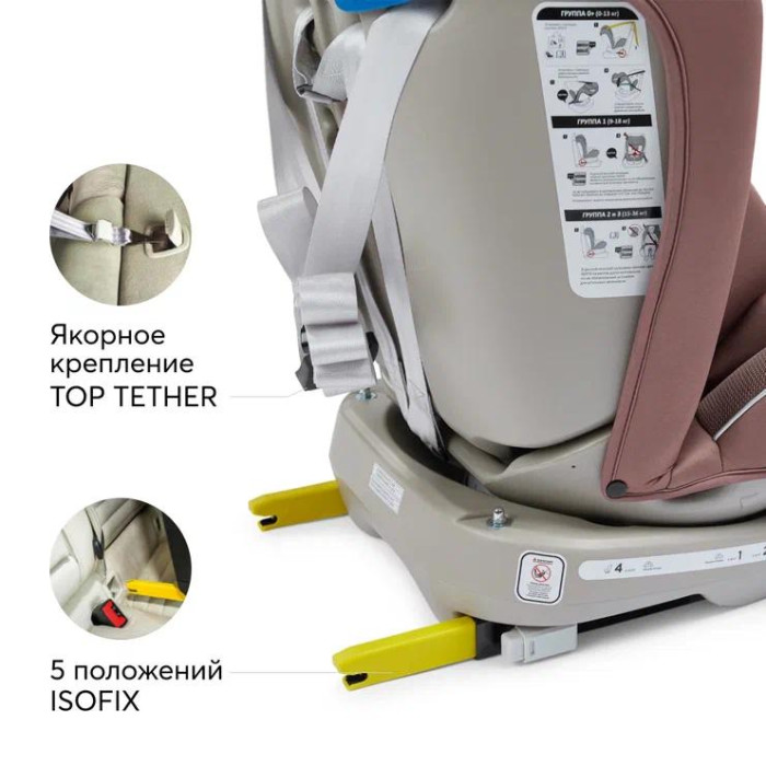 Для группы 0+ (0-13 кг) - трехточечные автомобильные ремни или система ISOFIX и якорный ремень Top Tether. Разрешено устанавливать только в положении наклона 4. Запрещается использовать любой другой наклон.