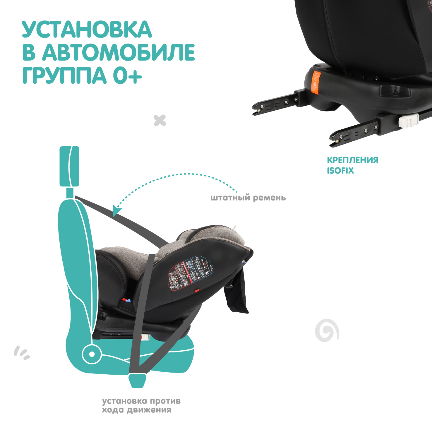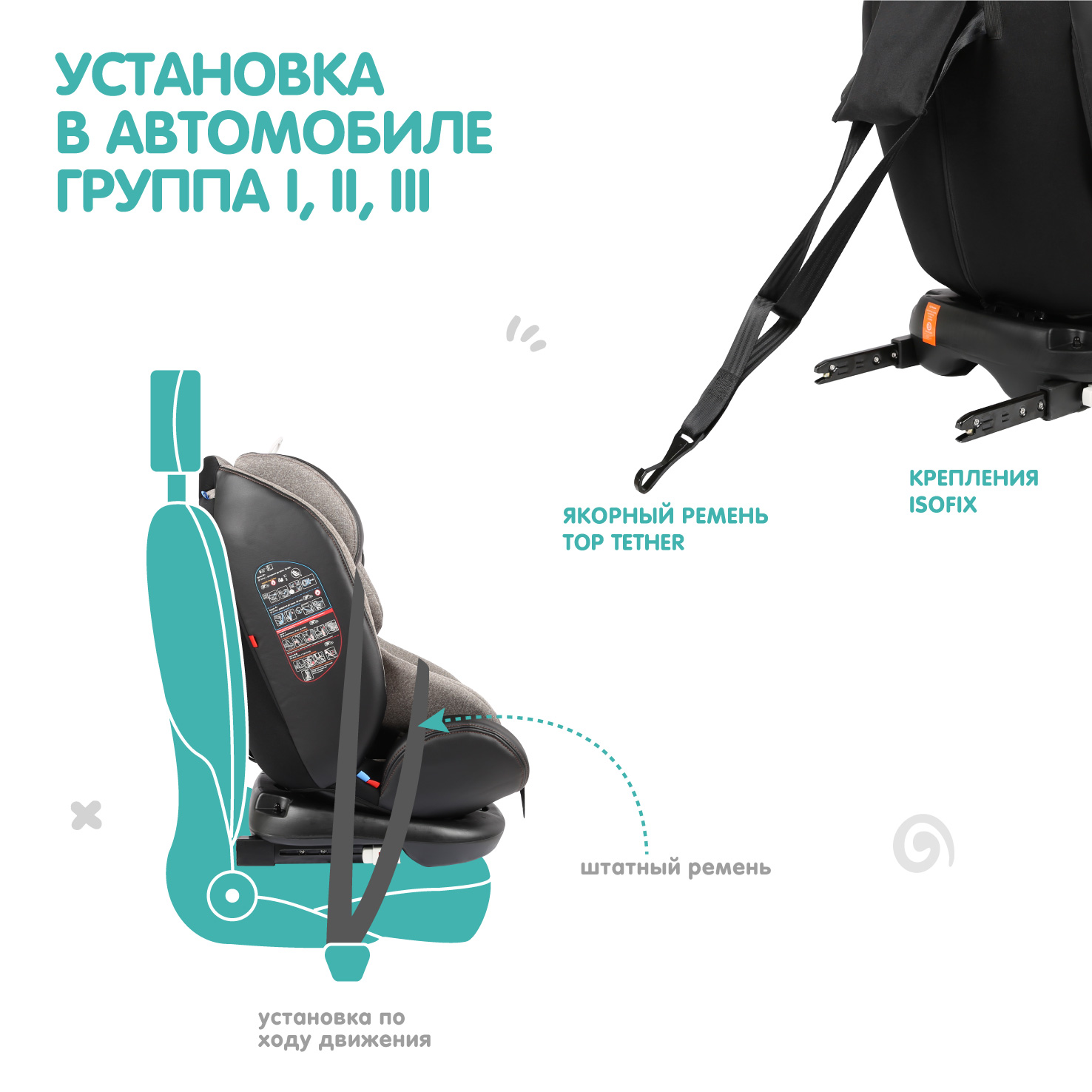 • Тип крепления: группа 0+ Isofix + якорный ремень Top Tether, или штатный ремень; группа 1/2/3 – Isofix + штатный ремень, или только штатный ремень.