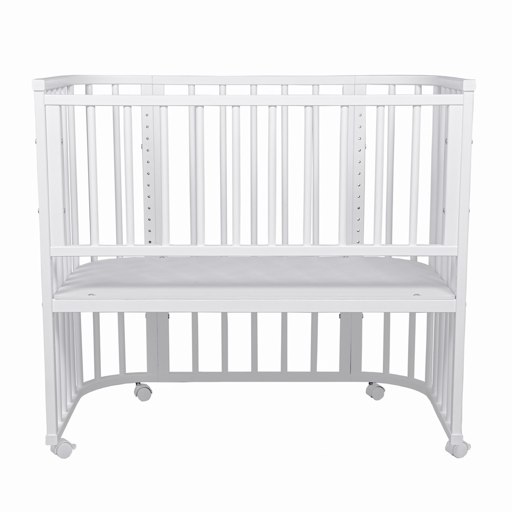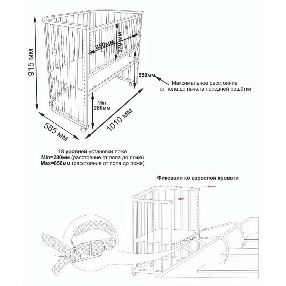 Кроватка имеет специальные крепления, чтобы надежно фиксироваться к взрослой кровати. Высота спального ложа регулируется по высоте в 14! положениях, что позволит идеально отрегулировать нужную высоту. Передний бортик съемный. Он позволит днем использовать кровать как мобильную колыбельку, а ночью без бортиков как приставную. Днем кроватку удобно перемещать по комнате благодаря 4 колесам. Впоследствии может использоваться в качестве столика или стойки для игрушек. Использовать для детей возрастом до 5 месяцев!