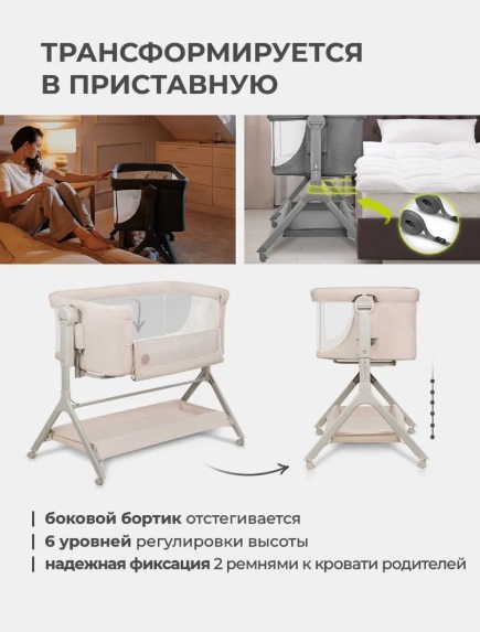- приставная кровать. Для ночного сна рядом с родителями колыбель придвигается вплотную к взрослой кровати, фиксируется спец ремнями ( в комплекте) и опускается передний бортик. Вы сможете контролировать сон ребенка, а малыш будет спать более спокойно и крепко, чувствуя присутствие родителей.
