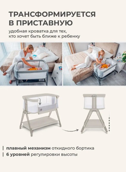 - приставная кровать. Для ночного сна рядом с родителями колыбель придвигается вплотную к взрослой кровати, фиксируется спец ремнями ( в комплекте) и опускается передний бортик. Вы сможете контролировать сон ребенка, а малыш будет спать более спокойно и крепко, чувствуя присутствие родителей.