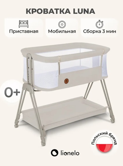 Колыбель Lionelo Luna (Лионело луна) - детская кроватка с опускающимся бортиком и колесами. Кроватка подойдет для ребенка с рождения до 9 кг, примерно до 6-8 месяцев, или до момента когда малыш начнет активно переворачиваться или садиться.