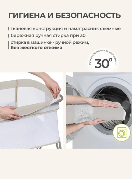 Вся обивка кроватки выполнена из качественных и натуральных материалов. Большое сетчатое вентилируемое пространство обеспечивает хорошую вентиляцию и обзор за ребенком. Обивка кроватки снимается для стирки.