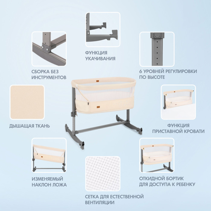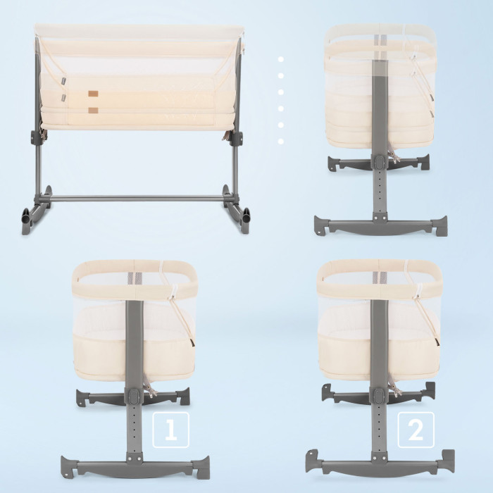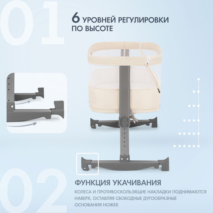 - Регулировка высоты кроватки в 6 положениях (от 19 до 40 см)