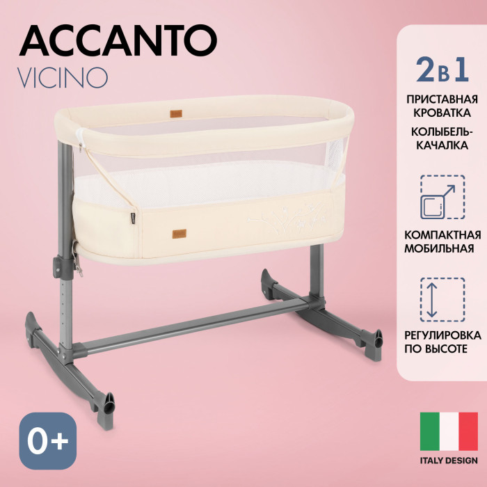 Accanto Vicino это полноценная кровать –колыбелька, которая идеально подойдет для первых месяцев после рождения ребенка. Она мобильная, уютная и безопасная. А приятные расцветки и высокое качество исполнения обязательно понравится молодым родителям.