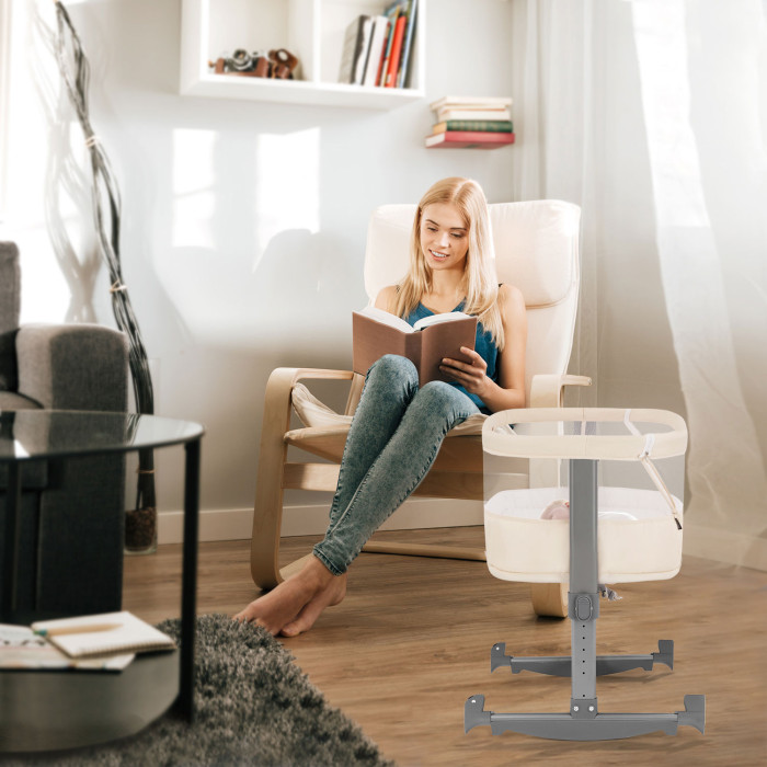 Приставная кровать Nuovita Accanto Vicino (Нуовита Акканто Вичино) – функциональная кроватка для ребенка с рождения до примерно 6 месяцев. Кроватка колыбелька имеет большое спальное место и мягкий матрасик со съемным чехлом. Выполненная из качественных, натуральных материалов Accanto Vicino имеет мягкий тканевый бортик по периметру и сетчатые стенки , которые улучшат циркуляцию воздуха и позволят родителям всегда видеть ребенка. Один бортик снимается с помощью молний по бокам и тогда кроватку можно использовать как приставную к взрослой кровати (ремень для крепления в комплекте). Чтобы отрегулировать и настроить модель предусмотрены удобные регулировки по высоте и возможность менять наклон ложа, что обеспечит дополнительную безопасность крохи. У кроватки предусмотрена функция качания из стороны в сторону, которая при необходимости блокируется.