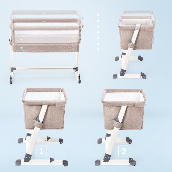У кровати предусмотрено несколько регулировок по высоте, а так же наклон кроватки с одной стороны. Что предотвращает срыгивание ребенка после кормления, а так же улучшает циркуляцию воздуха в колыбельке.
