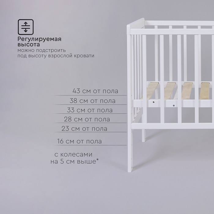 Кровать может быть установлена в 5 положениях по высоте (16см, 23 см, 28 см, 33см, 38см и 43 см от пола), за счет чего она подойдет к любой взрослой кровати. Реечное дно обеспечит вентиляцию матраса.