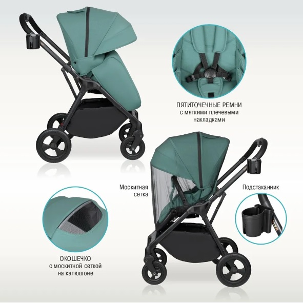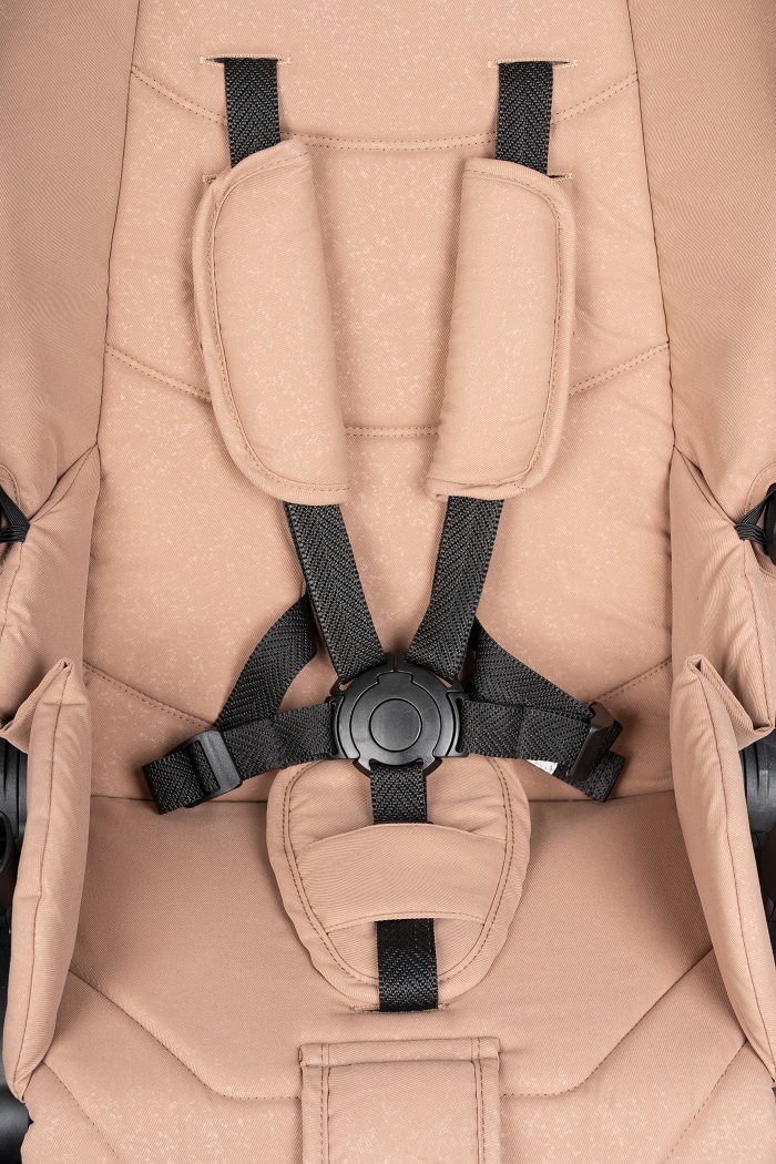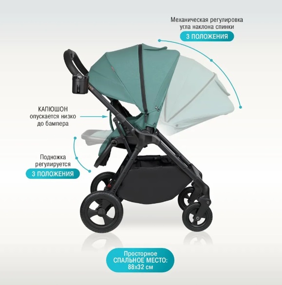 Сидение колясочки очень комфортное и имеет внутренние размеры с учетом спинки и подножки 88х32 см. Спинка коляски механически регулируется до почти горизонтального положения, позволяя ребенку комфортно спать на улице по нескольку часов. Для безопасности крохи предусмотрены ремни безопасности, легкосъемный бампер и перемычка между ног от сползания. Подножка поднимается, позволяя увеличить сидение для ребенка и позволить ножкам удобно разместиться на коляске.