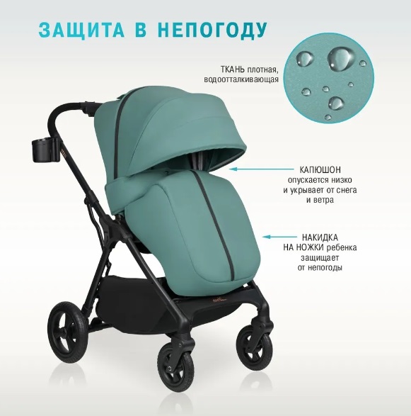 Обратите внимание, у коляски большой капюшон, который надежно защищает ребенка даже с полностью опущенной спинкой. Обивка коляски выполнена из плотной водоотталкивающей ткани, поэтому ваш малыш будет надежно защищен от небольшого дождя. Для защиты от ветра и холода предусмотрена удобная накидка на ножки.
