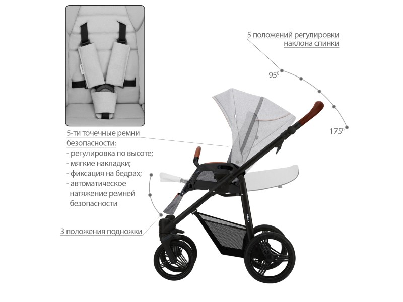 Регулируемые 5-точечные ремни безопасности с мягкими накладками на плечи.
