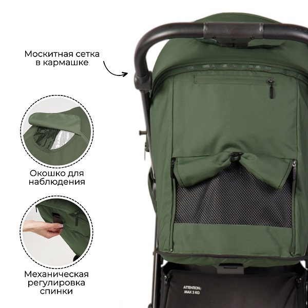 Крепкая и надежная рама позволяет выдерживать нагрузку до 22 кг, что позволит пользоваться коляской очень долго ( при необходимости до 4-5 лет). Широкое сидение 36 см в ширину, оснащено регулируемой по высоте спинкой и подножкой. Высота спинки+подножка+ сидение составляет 93 см в длину, поэтому до 2-3 лет ребенок может с комфортном спать на улице, как в кроватке. Спинка регулируется механически, а значит одно нажатие и спинка плавно поднимается или опускается, без ремешков, без резких движений и усилий. Спинка опускается до горизонтального положения, что важно, пока ребенок маленький и еще не сидит самостоятельно. За безопасность крохи отвечают надежные регулируемые ремни безопасности, ремешок от сползания, бампер из качественной эко кожи, который легко отстегивается или снимается.