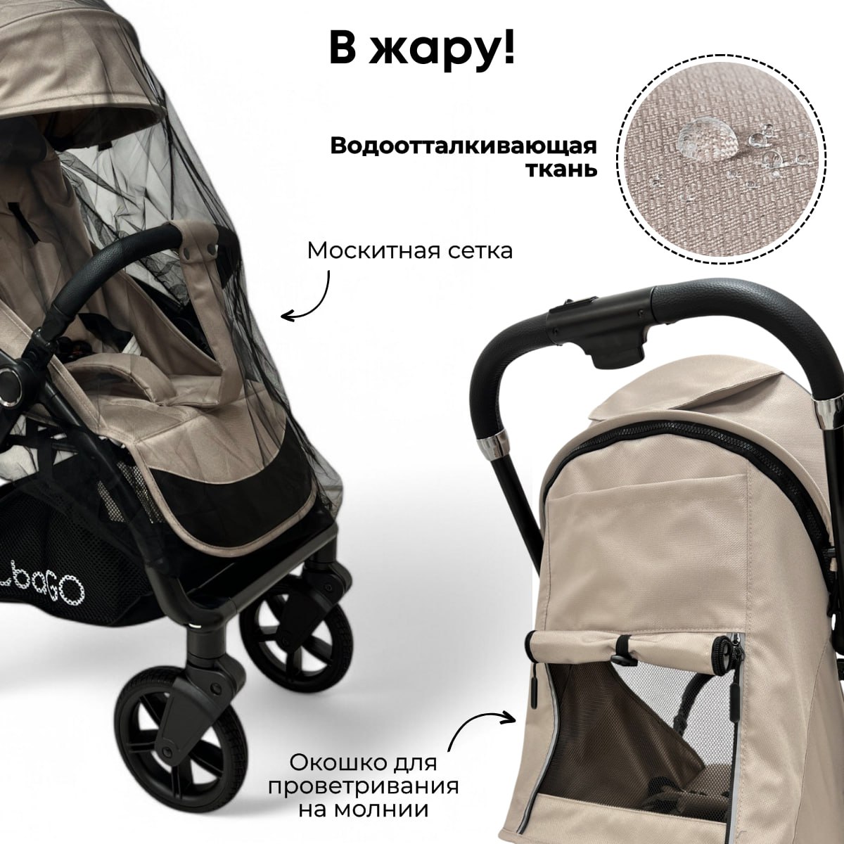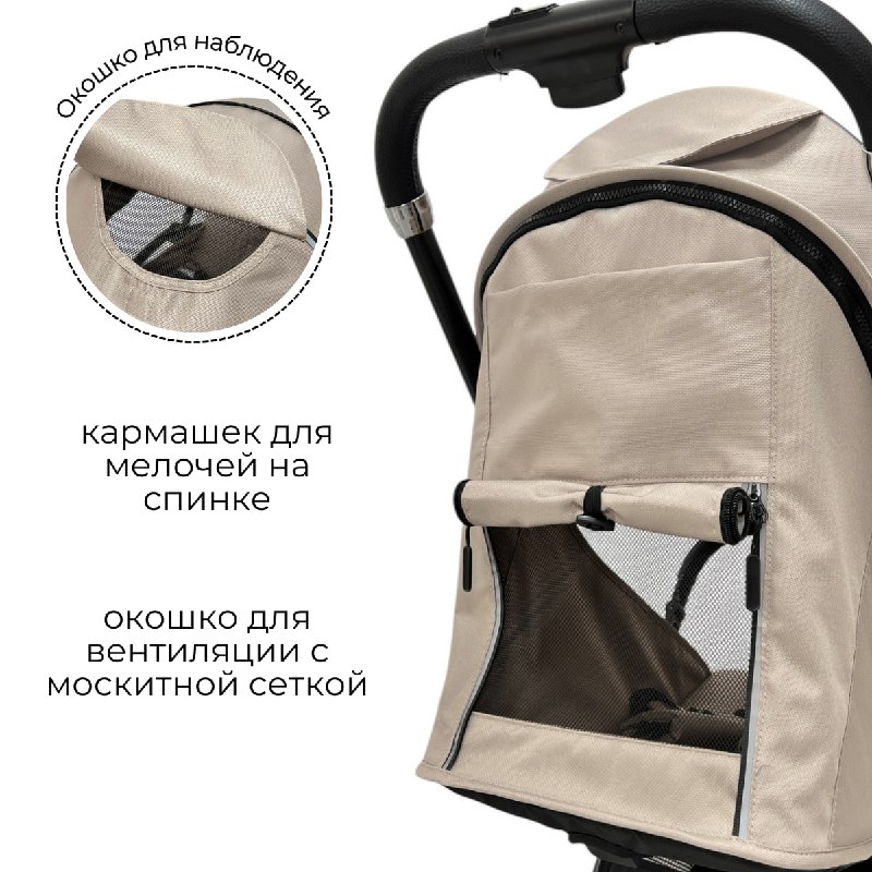 - Проветривание: Окошко для проветривания на спинке коляски с защитной сеткой обеспечит доступ воздуха в жаркую погоду, оградив малыша от выпадения.