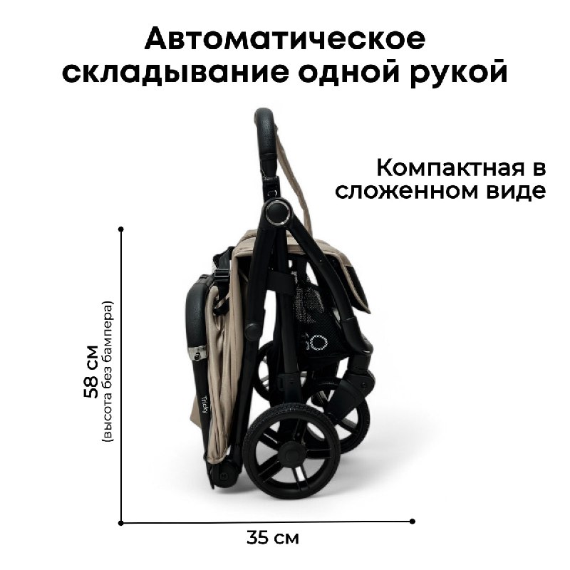 Компактный дизайн и удобство складывания. Ручка коляски BubaGO Tricky покрыта тактильно приятной эко-кожей и разделена кнопкой складывания. Нажмите на нее – и коляска сложится сама за мгновение. В сложенном виде Tricky компактна и легко помещается в маленькой прихожей, под столом в ресторане или в багажнике любого автомобиля. За счет небольшого веса коляску удобно использовать даже в доме без лифта. Возьмите ребенка на руки, нажмите на кнопку и поднимите коляску, словно сумку, держа за бампер.