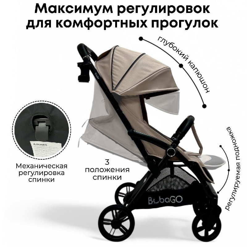 - Регулируемая подножка, спинка и капюшон с дополнительными секциями: Адаптируйте основные элементы коляски для комфорта вашего ребенка.