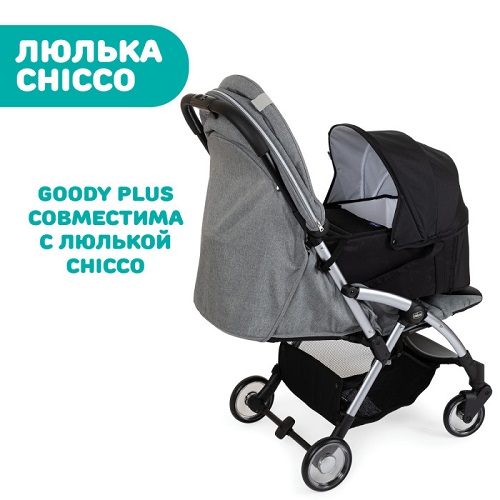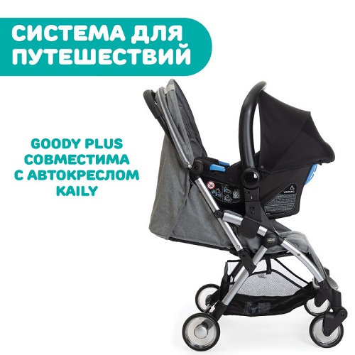 Система для путешествий. Goody Plus легко превратить в полноценную систему для путешествий: коляска совместима с автокреслом Chicco Kaily, а также с люлькой Chicco (приобретаются дополнительно).