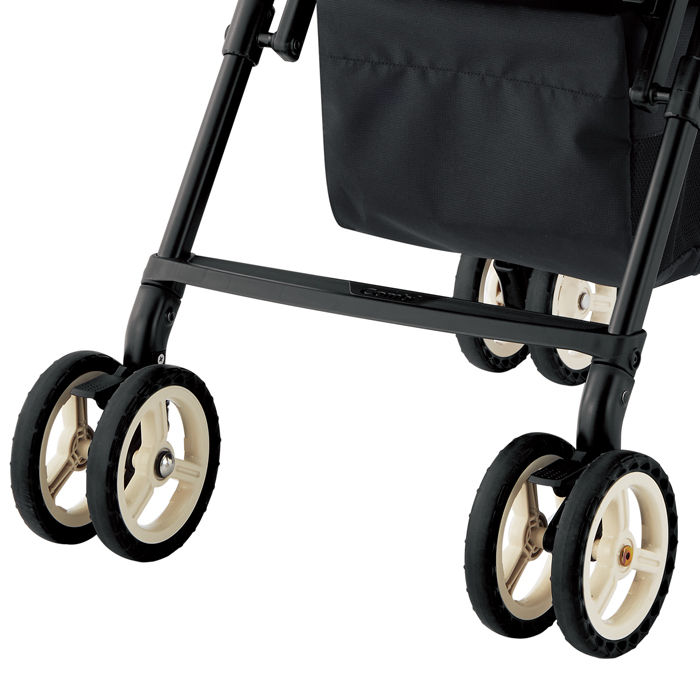 Воздушная конструкция шин и очень чувствительные амортизаторы Воздушная конструкция шин и амортизаторы позволят сгладить все неровности дороги и упрощают управление коляской.