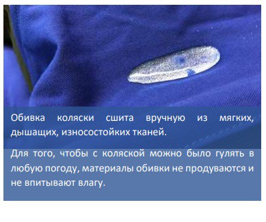 Внешняя часть люльки выполнена из прочной и надежной ткани. Такая обивка защищает малыша от непогоды, но при этом позволяет внутренним тканям дышать.
