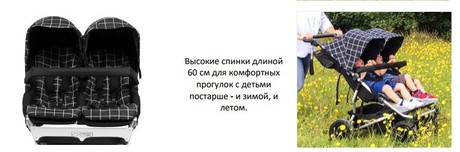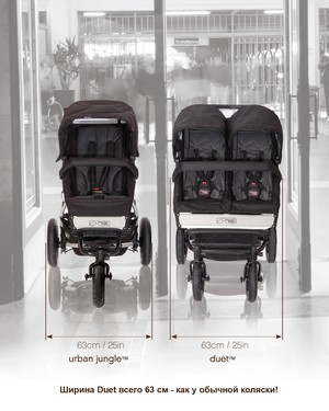 Коляска MOUNTAIN BUGGY DUET (маунтин багги дует) - самая компактная двухместная коляска с шасси всего 65 см. Это единственная коляска, которой управлять сможет даже очень хрупкая мама или бабушка. Коляска легко проедет везде, куда может заехать простая прогулочная коляска с одним малышом. Теперь у вас не будет проблем с лифтом или дверным проемом. При этом не будем забывать, что самое главное для коляски не только удобство для родителей, но и комфорт для малышей. И могу вас заверить, что вашим двойняшкам или погодкам коляска тоже очень понравится. Люльки выполнены из качественного плотного материала и прекрасно подойдут даже для зимних прогулок. Размер люлек 78х25х20 см. этого прекрасно хватит до 6 месяцев, а потом можно с легкостью пересаживать малышей в прогулочные блоки, ведь они тоже раскладываются до полностью горизонтального положения, достаточно удобные и комфортные. А если вы переживаете, что в зимний период времени малышам будет холодно в прогулке, то коляску можно укомплектовать любым теплым конвертом (приобретается отдельно), и ваши малыши комфортно будут спать на улице даже в сильные морозы.