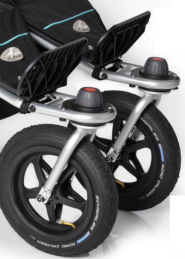 У коляски большие надувные колеса с амортизацией, поэтому, несмотря на свои размеры и вес двоих малышей, коляска отлично справиться с любыми дорогами.