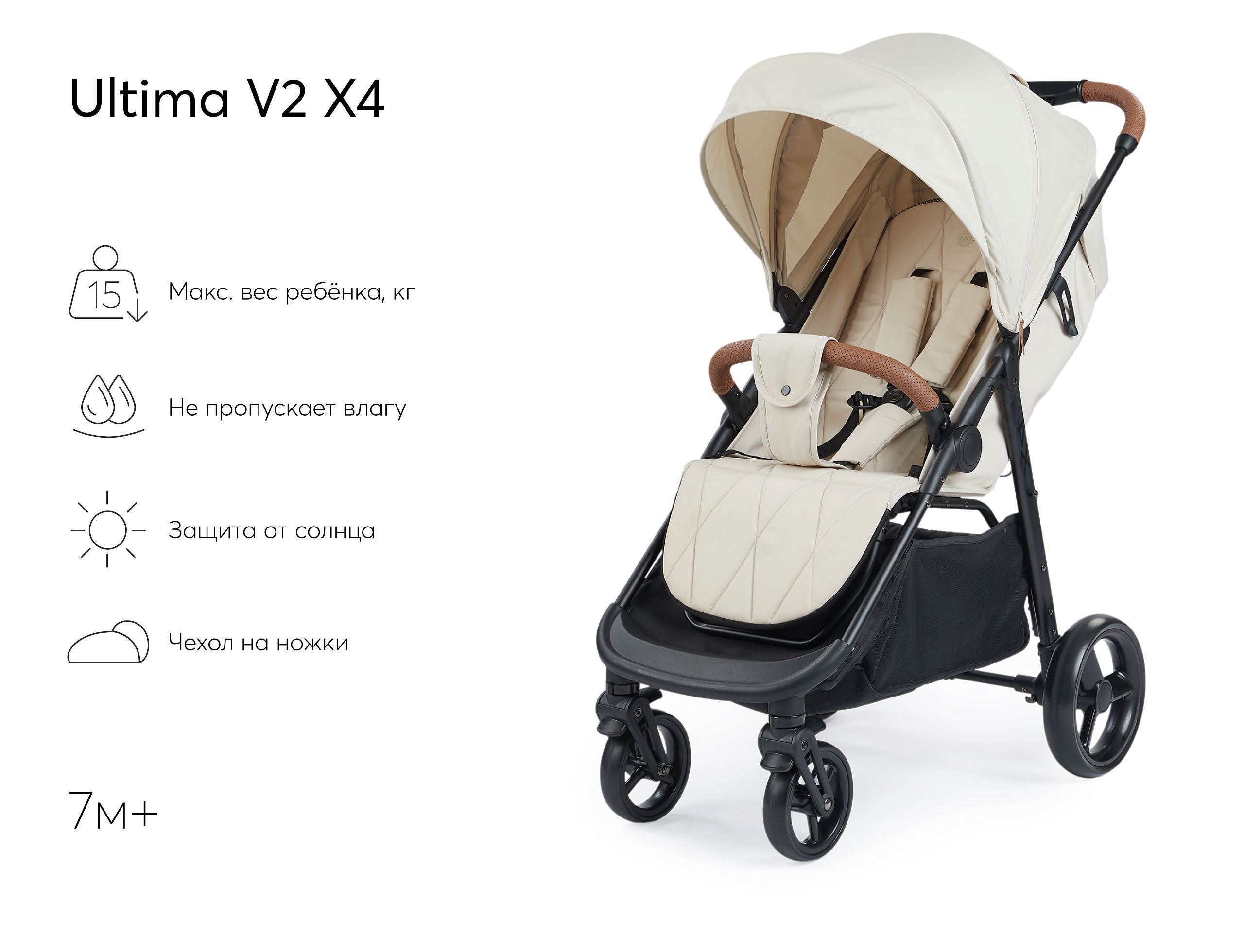 Happy Baby ULTIMA V2 X4 (хеппи беби ультима в2 икс 4) - прогулочная коляска для ребенка от 7 месяцев с большим спальным местом и отличными внедорожными свойствами. Она воплотила в себе мечты мам об идеальной коляске. Усовершенствованная рама позволит сложить коляску одной рукой, а полиуретановые колеса гарантируют долгий срок службы и плавный ход в движении. Просторное спальное место с регулируемой спинкой создаст комфорт даже для крупных малышей в зимней одежде. Большой капюшон до бампера защитит малыша от ветра или солнечных лучей, а смотровое окошко позволит ему всегда быть в поле зрения мамы. Благодаря большой рукоятке со съёмным чехлом из эко-кожи, управление стало еще легче и приносит настоящее удовольствие. Бампер в специальном чехле из высококачественной экокожи расположен на удобной для малыша высоте, а пятиточечные ремни безопасности и отстегивающийся разделитель для ног гарантируют особую безопасность во время движения. Вместительная корзина тоже преобразилась, и теперь у вас всегда есть к ней доступ даже в горизонтальном положении спинки, когда малыш спит. Удобный карман для мелочей и окошко на магните делают ULTIMA V2 X4 еще более практичной. Коляска выполнена из качественных материалов, имеет теплый чехол на ножки и комплектуется дождевиком и москитной сеткой.