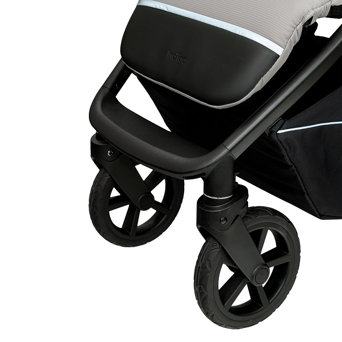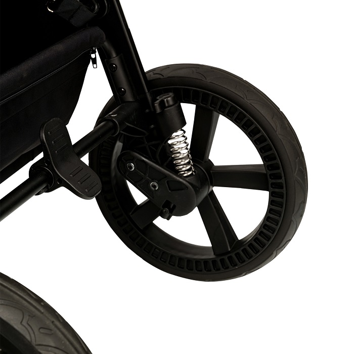 Коляска оснащена большими резиновыми бескамерными колёсами с пружиной амортизацией на каждом колесе, которая обеспечивает коляски мягкий ход и спокойный сон ребёнку.
