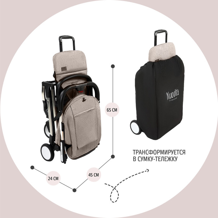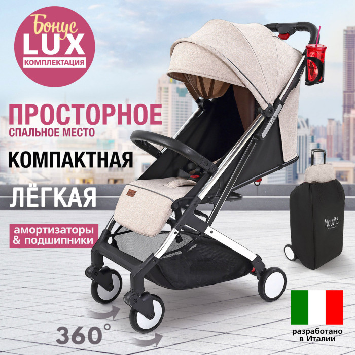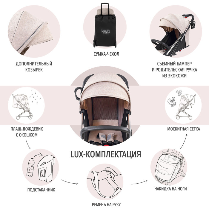 Коляска Nuovita Anima (нуовита анима) - стильная коляска с компактным сложение и легким весом для детей от 6 месяцев. Модель оснащена всем необходимым функционалом для комфортных прогулок в теплую или прохладную погоду. Для жаркого времени года предусмотрено несколько вентиляционных окошков и возможность полностью поднять заднюю часть капюшона для проветривания. Вся ткань коляски с влагоотталкивающим эффектом и с защитой от УФ лучей. Модель очень компактно складывается, предусмотрена ручка для переноски и чехол для сохранности коляски чистой в сложенном виде.