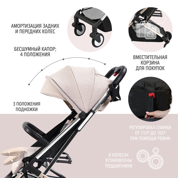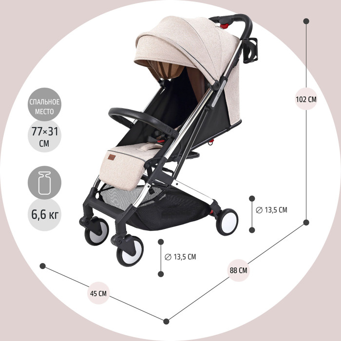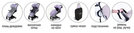 В комплекте: дождевик, москитная сетка, накидка на ножки, сумка-чехол для транспортировки, подстаканник, ремень на ручку.