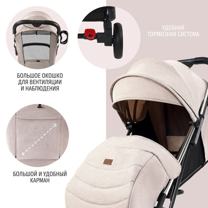 Обивка коляски тканевая с влагоотталкивающим эффектом и защитой от УФ лучей.